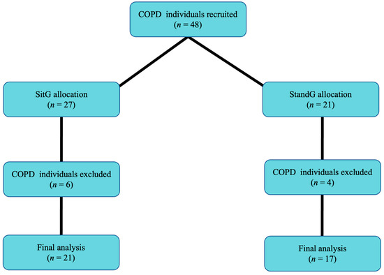 Forty-eight COPD individuals were recruited. Thirty-eight concluded the acute SVT protocol and were allocated to two different postures on the SAVP: SitG (n = 21) e StandG (n = 17). Ten COPD individuals gave up for personal reasons (Figure 1).