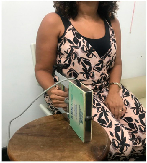 The individuals were in the seated position, arms in adduction, bent 90° forward at the elbow joint, forearm in neutral position, wrist with extension between 0° and 30°, and ulnar flexion between 0° and 15°. Subjects performed three maximum attempts with a manual dynamometer (EMG832WF, EMG System, São José dos Campos/SP) with the right hand, for 6 s each, verbal encouragement, and 30 s of rest. (Figure 2).