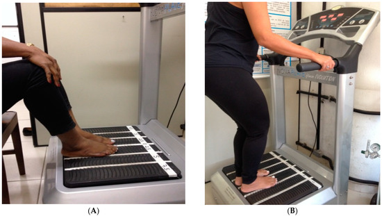 The COPD individuals of the Sitting group (SitG) were sitting in an ancillary chair (Figure 3A) in front of the VP with the feet on the base of the VP and the hands maintained in contact with their knees. The individuals of the Stand group (StandG) were standing on the base of the SAVP (Figure 3B). The individuals in both groups had a squat position with the knees flexed at 120–130° (measured using a goniometer Carci®, São Paulo, Brazil).