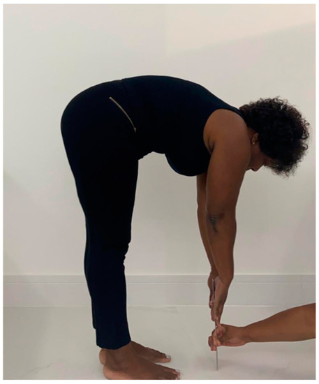 The range of motion of the trunk in the anterior trunk flexibility evaluation was measured by the ATF test [30,38] that is also called the fingertip-to-floor distance (FTFD) test [39]. This test consisted in measuring the distance between of the tip of the third finger and the floor, expressed in centimeters, after an anterior trunk flexion, with feet together, without bending the knees [38]. The test was applied before and after the SVT session (Figure 4).