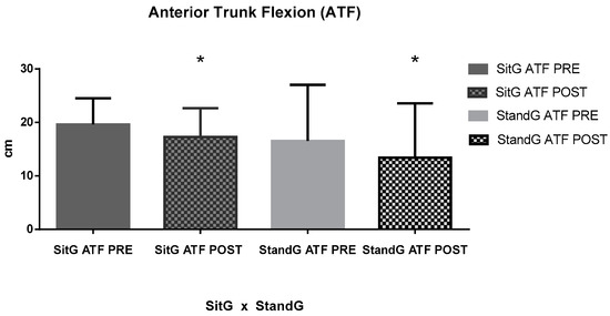 Anterior trunk flexion (ATF); Sitting group (SitG); Stand group (StandG). ATF measure of the Sitting group in pre-session (SiTG ATF PRE); ATF measure of the Sitting group in post-session (SiTG ATF POST); ATF measure of the Standing group in pre-session (StandG ATF PRE); ATF measure of the Standing group in post-session (StandG ATF POST). * p ≤ 0.05 pre × post session.