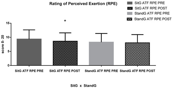 RPE of the ATF. Rating of Perceived Exertion (RPE); ATF—anterior trunk flexion (ATF); Sitting group (SitG); Stand group (StandG). Rating of Perceived Exertion of the anterior trunk flexion by the Sitting group during the pre-session (SitG ATF RPE PRE); Rating of Perceived Exertion of the anterior trunk flexion by the Sitting group during the post-session (SitG ATF RPE POST); Rating of Perceived Exertion of the anterior trunk flexion by the Standing group during the pre-session (StandG ATF RPE PRE); Rating of Perceived Exertion of the anterior trunk flexion by the Sitting group during the post-session (StandG ATF RPE POST). * p ≤ 0.05 pre vs. post session.