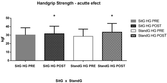 Analyzing the HG in the SitG pre-session (30.24 ± 8.44 kgf) and post session (31.61 ± 8.91 kgf), p = 0.12, no significant increase was observed. Comparing the StandG pre-session (28.64 ± 8.46 kgf) and post session (33.49 ± 10.30 kgf), p = 0.03, a significant increase of the HG was found (Figure 5).