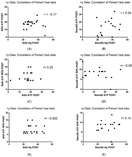 Pearson correlation analysis (r) between HG parameters and the ATF and the RPE of the ATF was performed and is represented in Figure 8A–F. Considering the correlation between ATF and HG (Figure 8A,B), SitG presented a negative correlation (r = − 0.17, p = 0.46) while the StandG presented a correlation between these variables (r = 0.34, p = 0.17). The correlation analysis between RPE and ATF (Figure 8C,D) showed a positive correlation for SitG (r = 0.20, p = 0.37) and negative for StandG (r = − 0.26, p = 0.30). A negative correlation was observed between the RPE and HG in SitG (Figure 8E, r = − 0.002, p = 0.99), while a positive correlation was found between the RPE and HG in StandG (Figure 8F, r = 0.13, p = 0.61).