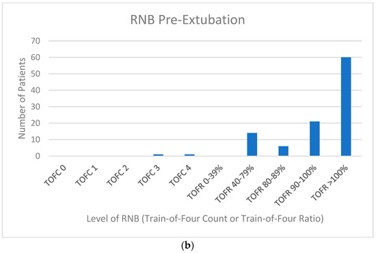 Figure 1. (a)—RNB pre-neostigmine administration—histogram indicating number of patients at each Train-of-Four Count (TOFC) or Train-of-Four Ratio (TOFR) as their level of residual neuromuscular blockade (RNB) when analyzed at the preneostigmine administration time point. Total number of patients evaluated = 104. (b)—RNB pre-extubation—histogram indicating number of patients at each Train-of-Four Count (TOFC) or Train-of-Four Ratio (TOFR) as their level of residual neuromuscular blockade (RNB) when analyzed at the pre-extubation time point. Total number of patients evaluated = 94.