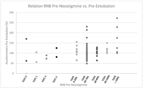 Figure 2. Relation of RNB pre-neostigmine vs. pre-extubation—dot plot indicating the pre-extubation accelerometry level achieved as a function of the level of residual neuromuscular blockade (RNB) present at the time of neostigmine administration. X-axis indicates the patients achieving various levels of Train-of-Four Count (TOFC) or Train-of-Four Ratio (TOFR) at the pre-neostigmine administration time point. Y-axis indicates the accelerometry level achieved at the pre-extubation time point for individual patients within each pre-neostigmine level of TOFC or TOFR. Accelerometry level of “0” indicates patients whose pre-extubation RNB was less than TOFC 4 and therefore could not be quantified by acceleromyograhphy. Ninety-three of ninety-four patients had RNB values obtained at both pre-neostigmine and pre-extubation time points. One excluded patient had post-extubation TOFC 4 but no indication of TOFR associated with this.