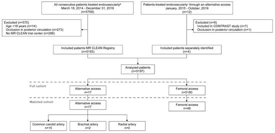 This was a retrospective observational study from the Multicenter Randomized Clinical Trial of Endovascular Treatment for Acute Ischemic Stroke in the Netherlands (MR CLEAN) Registry, between March 2014 and December 2018. The MR CLEAN Registry is a multicenter, observational study in which all patients who underwent EVT (defined as any procedure with a performed arterial puncture in the angiography suite with the aim to remove the intracranial thrombus) in the Netherlands were enrolled. The study design and patient eligibility criteria have been reported previously []. In addition, all local principal investigators from the 17 participating centers of MR CLEAN Registry were requested to identify patients who were not included in the MR CLEAN Registry and had undergone EVT through an alternative access route between January 2015 and October 2019.