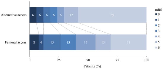 Visual inspection of the mRS score revealed a different distribution between the alternative and femoral access groups. In particular, mortality seemed to be more common among patients treated through alternative access. This could possibly be due to the higher (numerical but not significant) rate of puncture related complications and prolonged procedure duration. We therefore analyzed mortality as a separate endpoint, however, the difference that was observed between both groups could not be confirmed statistically due to low power. As for the other endpoints, the uncertainty of the effect estimate was large, and therefore, definite conclusions could not be drawn. The risk of death after alternative access was comparable between our study and other studies [,]. Larger observational studies and systematic reviews and meta-analyses did not compare mortality rates between EVT through alternative and femoral access [,,,].
