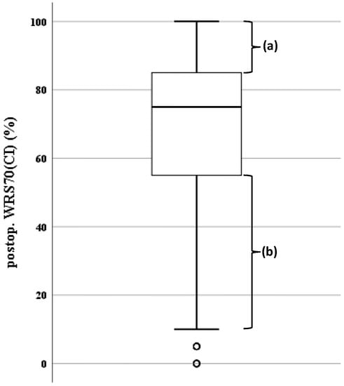 Boxplot of postoperative WRS70(CI). Representation of the median, the first and third quartiles, the minimum, maximum and outliers; the lower whisker extends to 1.5 times the interquartile range (IQR) and the upper whisker to the 100% limit. The bracket (a) indicates WRS70(CI) values above the 75th percentile (‘good performers’) and the bracket (b) values below the 25th percentile (‘poor performers’).