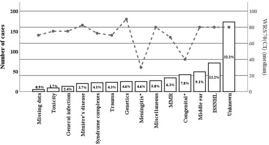 Figure 2 shows the distribution among the aetiological categories. The numerically largest category was ‘unknown’, at 32.2%. This was followed by ‘idiopathic sudden sensorineural hearing loss’ (ISSNHL, 13.2%), ‘middle ear’ (9.1%) and ‘congenital’ (7.8%). Although the category ‘unknown’ was large, it was in fact smaller than frequently reported (typically 44–62% [,,]). In addition, the medians of WRS70(CI) (postoperative speech comprehension) are plotted for each category. Relatively low medians of WRS70(CI) are seen for ‘meningitis’ and ‘congenital’, with relatively high medians for ‘genetics’ and ‘Ménière’s disease’.