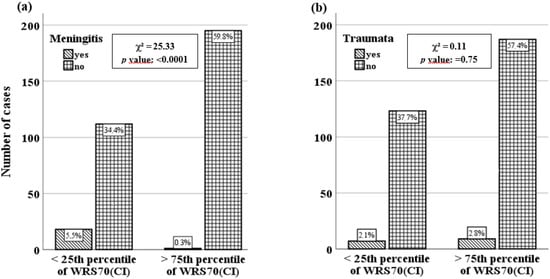 Two examples of the distribution of aetiology (present ‘yes’ or ‘no’) in relation to the dichotomous outcome measure above the 75th percentile (good performer) and below the 25th percentile (poor performer). (a) ‘Meningitis’, showing significant association with the dichotomous WRS70(CI); (b) ‘trauma’, showing no significant association. Statistics from the χ2 test are shown.