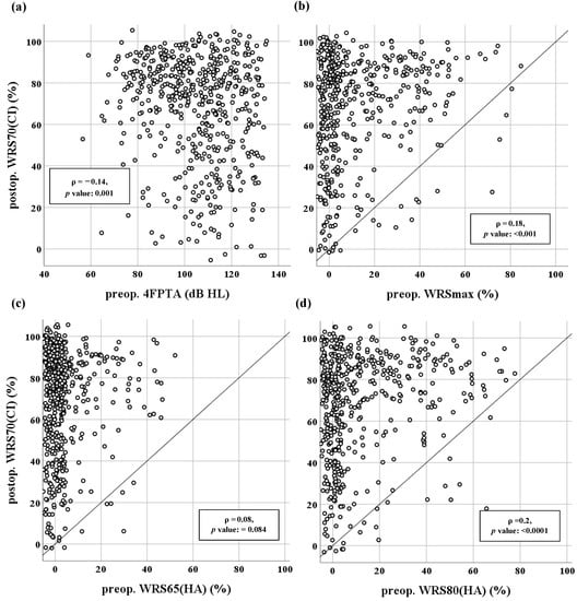 In our study, WRS80(HA) was also considered. With the CI, 97.7% of the ears in the postoperative measurement at 70 dBSPL achieved or surpassed the preoperative WRS80(HA). In addition to WRSmax, used in studies by Hoppe et al. [], WRS80(HA) could be used as a predictor of minimum postoperative speech comprehension. Compared with WRS65(HA), the use of WRS80(HA) is justified by a lower percentage of ears with no preoperative speech comprehension (0%) and a higher overall mean value of preoperative speech comprehension (Table 1, Figure 4). Preoperative WRSmax and WRS80(HA) showed comparable mean values and also approximately similar values in terms of numbers of ears with 0% speech comprehension. However, the correlation of WRS80(HA) with WRS70(CI) proved to be stronger than that of WRSmax with WRS70CI. Reference data regarding the latter variable are, to the best of our knowledge, not available in the literature.