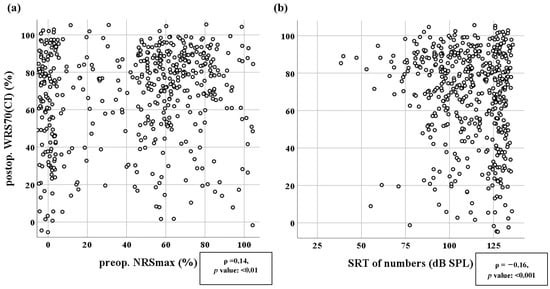 Postoperative speech comprehension with CI at 70 dBSPL (WRS70CI) depending on (a) preoperative maximum two-digit number recognition score (NRSmax), and (b) preoperative SRT of two-digit numbers without a hearing aid. Statistics of the Spearman rank test are given. (a) n = 493, (b) n = 492. Data are presented as jitter plots (see text).