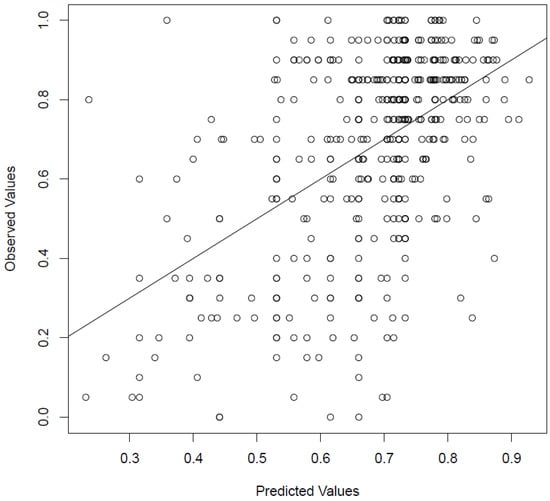 Comparison between observed and predicted values of WRS70(CI) based on the quasibinomial model (n = 538). Decimal values correspond to percentages (e.g., 0.3 = 30%). The line corresponds to equality between measured values and the model. Accordingly, values above this line were underestimated in the prediction and values below it were overestimated.