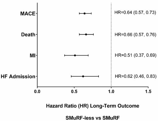 - Anderson, J.L.; Knight May, H.T.S.; Le, V.T.; Almajed, J.; Bair, T.L.; Knowlton, K.U.; Muhlestein, J.B. Cardiovascular Outcomes of St-Elevation Myocardial Infarction (Stemi) Patients without Standard Modifiable Risk Factors (Smurf-Less): The Intermountain Healthcare Experience. J. Clin. Med. 2023, 12, 75. [Google Scholar] [CrossRef]