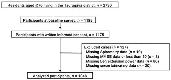 In 2002, we recruited participants for the Tsurugaya project and invited all aged residents aged 70 years and older (n = 2730). At the baseline survey, 1198 participants were enrolled in the project. We obtained informed consent from 1175 participants. The study flow chart was shown in Figure 1. We excluded 19 participants without spirometry data. To keep the measured indices reliable, we used the Mini–Mental State Examination (MMSE). Participants missing the MMSE score or <10 were excluded (n = 8). Participants missing or with incomplete leg force measurement records were excluded (n = 80). Participants without serum laboratory data were also excluded (n = 20). Finally, we analyzed 1048 participants.