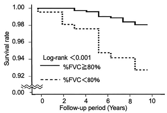 The number of deaths caused by pneumonia was 13 (1.6%) out of the 825 participants in the % FVC ≥ 80% group and 13 (5.8%) out of the 223 participants in the % FVC < 80% group. Figure 2 shows Kaplan–Meier survival curves associated with death caused by pneumonia according to the FVC% predicted. The % FVC < 80% group showed a significantly lower cumulative survival rate than the % FVC ≥ 80% group (log-rank test, p < 0.001).