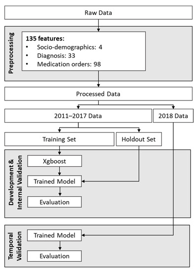 Workflow for development and temporal validation of the model developed using data from 2011 to 2017.