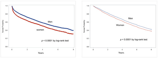 The survival probability in people with DFD, as evaluated using the Kaplan-Meier analysis, is reported in Figure 1. Survival probability was reduced among women as compared to men (p < 0.0001 by log-rank test) in both cohorts, with a mortality rate approaching 50% at 5 years for both genders. The impact on early mortality was higher after a first-incident DFD hospitalization among women than among men n = 429; 5.79 (5.27–6.37) vs. n = 656; 5.51 (5.10–5.94) per 1000 p-y; p < 0.05.