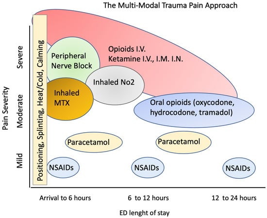 A multimodal pain approach, which involves the use of two or more drugs with different mechanisms of action, plays an important role in the relief of trauma pain [46]. It is defined as the integrated use of multiple strategies that include systemic analgesics, regional analgesic techniques and non-pharmacological interventions to affect peripheral and/or central nervous system sites in the pain pathway [61]. The concept of multimodal analgesia can be applied to the entire treatment continuum, with solutions adapted to each phase of treatment (Figure 1).
