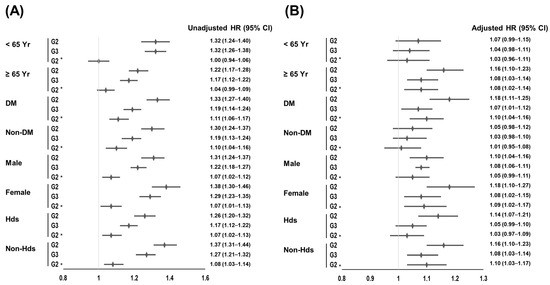 Forest plots for the HR and 95% CI according to subgroups. (A) Univariate Cox regression analysis; (B) multivariate Cox regression analyses. Adjustments were made according to age, sex, cause of end-stage renal disease, Charlson comorbidity index score, type of vascular access, hemodialysis vintage, ultrafiltration volume, Kt/Vurea, hemoglobin, serum albumin, serum creatinine, serum phosphorus, serum calcium, systolic blood pressure, diastolic blood pressure, and the use of aspirin or statin. Reference group for HR was G1, except for G3, which was a reference group for G2*. Abbreviations: CI, confidence interval; DM, diabetes mellitus; G1, patients without prescription for any anti-hypertensive drugs; G2, patients with prescription for other anti-hypertensive drugs except renin-angiotensin system blockers; and G3, patients with prescription for renin-angiotensin system blockers; Hds, patients with myocardial infarction or heart failure; Non-Hds, patients without myocardial infarction or heart failure; HR, hazard ratio; Yr, years.