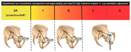 For SHRs that are low risk (SHR A), the use of a large-diameter bearing is of less importance and the anatomic cup version (TAL) is used as a reference. For high-risk SHRs, implants that reduce the risk of dislocation (LDH) can be used along with a cup version based on the TAL. For SHR B, there should be an increase in cup anteversion by 3.5° for every 10° deficit in pelvic retroversion when sitting. SHR D requires a reduction in cup anteversion by 3.5° for every 10° excessive retroversion when the patient is standing. For the high-risk THAs, we would recommend using a large-diameter bearing, fixed (LDH cups) or mobile (dual mobility) depending on a patient’s activity and life expectancy [