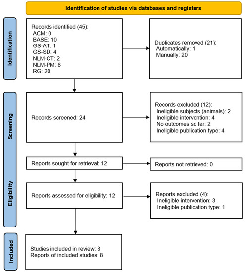Of the 45 records identified, eight studies were ultimately included in the review. The entire selection process is illustrated in Figure 1. The number of records found using each search engine is presented in Table 3. The agreement of the judges’ decisions at the screening stage was Cohen’s k = 0.83, which means almost perfect agreement. Items that were in dispute were moved to the full-text analysis stage in order to reach an agreement.