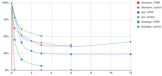 The lack of concealment of I-PRF administration from the patients, common for the analyzed randomized controlled studies, was not classified as increasing the risk of bias to a “High” value [53,54,55]. This decision was motivated by the fact that blinding the intervention from the patient would require redundant blood collection in control groups. Thus none of the studies included in the quantitative analysis were assessed as having a high risk of bias [53,54,55]. Another relatively easily eliminable problem of the lack of blinding of groups of patients from researchers making measurements in the course of post-intervention follow-up was unnecessarily present [53,54,55].