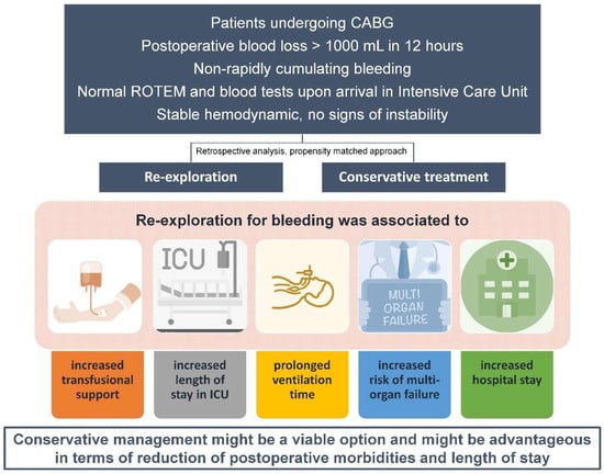 The incidence in a high-volume center of patients experiencing non-acute, non-life-threatening but significant blood loss after elective CABG highlights the importance of this challenging circumstance and the need for evidence-based guidance in its perioperative management. Besides the caveat of the retrospective nature of this study and the inherent related biases and hidden confounding factors, conservative management in these borderline situations might be a viable option and might be advantageous in terms of reduction of postoperative morbidities and length of stay (Figure 1). Further investigations are warranted to confirm these findings.