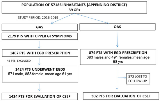 During the 3-year study (2016–2019) period in the Appennino District, 2179 cases (861 males and 1318 females, median age 61, IQR 47.72) were referred to GAS for upper GI symptoms. Among the district, 33/39 (84.6%) GPs, joined the GAS project. Among them, 1467 patients (67%) had a prescription for EGD and 712 (35%) did not. Three percent of patients (43 of 1467 patients) having an EGD prescription eventually refused it and were excluded from the analyses according to the study design; therefore, 1424 patients finally underwent EGD.