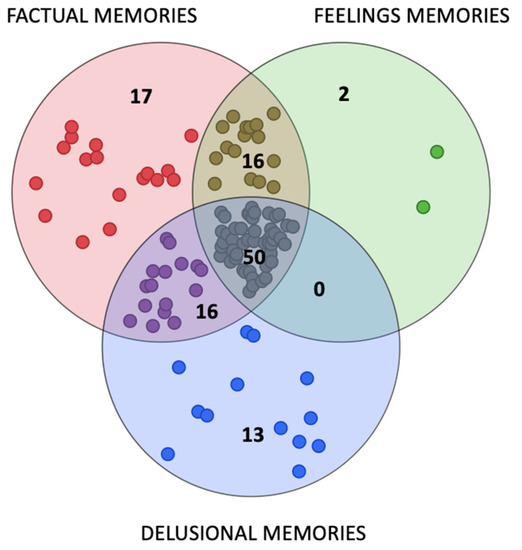 Most patients (77%) retained memories from the ICU. Of these, a large proportion (87%) had factual memories, and in particular recalled light and medical staff. Memories of feelings were retained by a smaller number of patients (60%), and most of them recall anxiety. A similar proportion of patients had delusional memories principally recalling dreams, hallucinations or nightmares. In most patients, two or three types of recall are simultaneously present (Figure 1) and only 13/114 (11%) patients had only delusional memories. Pre-ICU memories are reported by a similar percentage of patients (60%). Previous work reported a similar rate of survivors recalling ICU experience [33,35,36,37], even if differences in study design may limit generalizability of results. In particular, it can be speculated that specific populations (e.g., trauma patients) [38] could differ from ARDS patients for many factors affecting memory retention. Similarly, time of questionnaire administration (e.g., immediately after discharge vs. at 6 months) may affect the rate of recall and the degree of processing of the ICU experiences.
