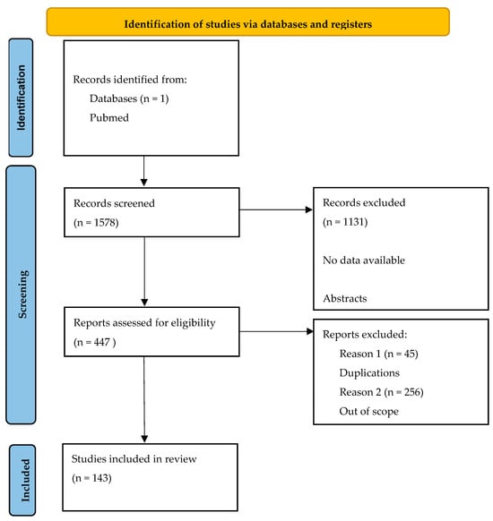 According to Figure 1, the search resulted in the retrieval of 5335 records, of which 1578 were screened for relevance and 143 were ultimately included in the qualitative synthesis.