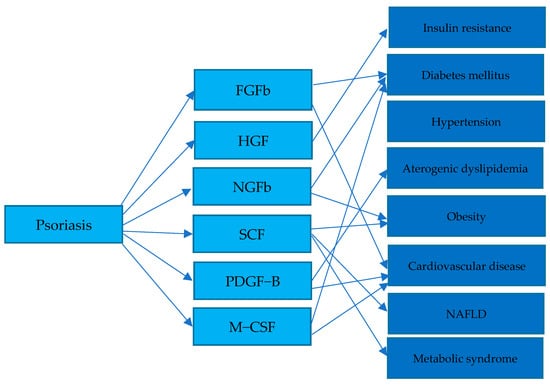 A medical literature search of PubMed (1985–present), conducted in the spring of 2023, was performed using appropriate terms without date limitations. The main object of the research was to identify the role of growth factors as a potential bridge between metabolic syndrome and psoriasis. Medical subject headline terms included “b-FGF and skin”, “b-FGF and skin diseases”, “b-FGF and psoriasis”, “b-FGF and metabolic syndrome”, “HGF and skin”, “HGF and skin diseases”, “HGF and psoriasis”, “HGF and metabolic syndrome”, “NGFb and skin”, “NGFb and skin diseases”, “NGF and psoriasis”, “NGFb and metabolic syndrome”, “SCF and skin”, “SCF and skin diseases”, “SCF and psoriasis”, “SCF and metabolic syndrome”, “PDGF-BB and skin”, “PDGF-BB and skin diseases”, “PDGF-BB and psoriasis”, “PDGF-BB and metabolic syndrome”, “M-CSF and skin”, “M-CSF and skin diseases”, “M-CSF and psoriasis”, “M-CSF and metabolic syndrome”, “VEGF and skin”, “VEGF and skin diseases”, “VEGF and psoriasis”, “VEGF and metabolic syndrome”, “TGF-α and skin”, “TGF-α and skin diseases”, “TGF-α and psoriasis”, “TGF-α and metabolic syndrome”, “TGF-β and skin”, “TGF-β and skin diseases”, “TGF-β and psoriasis”, “TGF-β and metabolic syndrome”, “EGF and skin”, “EGF and skin diseases”, “EGF and psoriasis”, “EGF and metabolic syndrome”, “IGF and skin”, “IGF and skin diseases”, “IGF and psoriasis”, and “IGF and metabolic syndrome”.