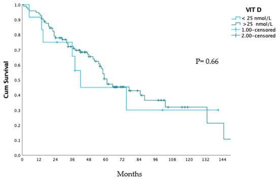 Table 2 shows the survival rates of the two groups at different points in time after liver surgery. The VIT D < 25 nmol/L group had lower survival rates compared to the VIT D ≥ 25 nmol/L group at all time points, and lower median overall survival (42 vs. 61 months, respectively). However, this difference was not statistically significant (p = 0.66). Figure 1 shows the overall survival curves of the two groups, which also did not show a significant difference (p = 0.66).