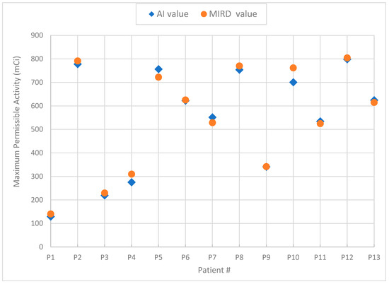 Two case examples are shown in Figure 3 to demonstrate the performance of the AI system in predicting the MPA value for P12 with a low residence time (AI value of 798 vs. MIRD value of 804 mCi) and P3 with a high residence time (AI value of 219 vs. MIRD value of 230 mCi), effectively demonstrating a 1% and 5% difference, respectively.