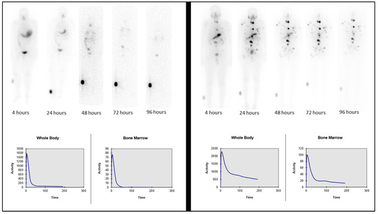 - Bone marrow dose limiting, originally introduced by Benua et al. in 1962 [19] and later by Leeper [20] and Benua and Leeper [21] and further improved with the introduction of the MIRD formulism (Medical Internal Radiation Dosimetry Committee of the Society of Nuclear Medicine). Bone marrow is the most radiosensitive tissue in the body and is commonly the dose-limiting one for radionuclide therapy [22]. The method is mainly concerned with the safety of the treatment and considers blood as a bone marrow surrogate [23]. This approach accepts a threshold of a blood-absorbed dose of 2 Gy (200 rad) to avoid myelotoxicity [24] and the generally accepted thresholds of a lesion-absorbed dose of 300 Gy for thyroid remnants and of 80 Gy for metastases. This method also takes into consideration the absorbed dose to the lungs, ensuring it remains below 30 Gy to avoid pulmonary fibrosis; this translates into a threshold of 4.4 GBq (120 mCi) as the whole-body retention at 48 h and of less than 3 GBq (80 mCi) for patients with iodine-avid diffuse lung metastases [21,24]. Based on this method, the activity in the whole body is measured using gamma camera imaging in conjugate views (anterior and posterior) following the administration of tracer activity. The frequency of the imaging scans and the time intervals for blood sampling are detailed in relevant publications [24] and usually involve imaging over a course of 4–5 days at time points of 2 h, 24 h, 48 h, 72 h, and 96 h post-administration, with some variations depending on the exact implementation. The activity in the blood is measured using serial blood sampling methods correlating with the imaging time points. Mathematical analysis is applied, usually through software, to integrate the various organ time–activity curves and to calculate the total absorbed dose of radiation to the blood [15]. The details of the formulism’s implementation are described in the MIRD pamphlets [25,26,27] and other relevant publications [11,22] and are beyond the scope of this manuscript. Software that implements the MIRD formulism was also developed [28].