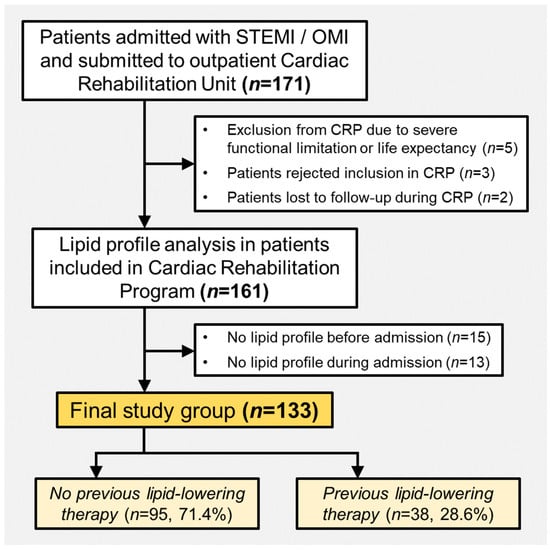 The study population comprised all patients admitted in our institution, a high-complexity tertiary care hospital, for ST-segment elevation myocardial infarction (STEMI) or occlusion myocardial infarction (OMI), i.e., those without persistent ST-segment elevation but other signs of acute coronary occlusion (e.g., persistent chest pain and left or right bundle branch block, transitory ST-segment elevation, or hyperacute T waves). Patients were referred to the Cardiac Rehabilitation Program (CRP) from January 2022 and October 2023. A total of 5 patients were excluded from the CRP due to severe functional limitation or life expectancy, 3 patients voluntarily rejected inclusion in the CRP, and 2 patients were lost to follow-up after inclusion in the CRP. After inclusion, we registered the lipid and metabolic profile analyzed during admission and prior to admission, if available. Some patients were excluded from the analysis due to unavailable lipid and metabolic profiles before (n = 15) or during admission (n = 13). The final study group comprised 133 patients. The patient flowchart is shown in Figure 1.