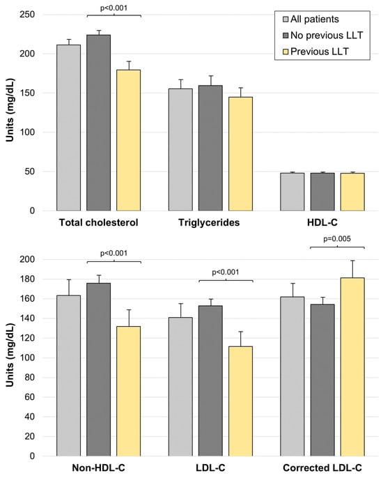 Compared to patients with previous LLT, patients without previous LLT experienced a significantly higher reduction in total cholesterol (−60.55 ± 41 vs. −20.87 ± 34.27 mg/dL, p < 0.001 for comparison), non-HDL-C (−52.07 ± 39.03 vs. −12.24 ± 32.87 mg/dL, p < 0.001 for comparison), and LDL-C levels (−48.76 ± 34.24 vs. −15.4 ± 23.4 mg/dL, p < 0.001 for comparison) during admission. On the contrary, when compared to basal corrected LDL-C levels, patients with previous LLT depicted a significantly higher reduction in LDL-C during admission (−88.72 ± 40.28 vs. −48.76 ± 34.24 mg/dL, p < 0.001 for comparison).
