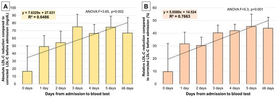 We calculated the absolute (in mg/dL) and relative (in %) difference in LDL-C levels from corrected basal LDL-C according to the days from admission to blood test extraction, and concurrent treatment with atorvastatin 80 mg o.d. (Figure 3). A significant absolute and relative reduction in LDL-C from basal levels was noted, and a significant correlation existed with days of admission until the blood test and the magnitude of LDL-C reduction (p = 0.002 and p < 0.001, respectively). When the blood test was sampled at day 1 or 2 after admission, reductions of approximately 30% in LDL-C levels were noted, which accounted for 40–45% in subsequent days. Regression analyses with corresponding formulas are depicted in Figure 3.