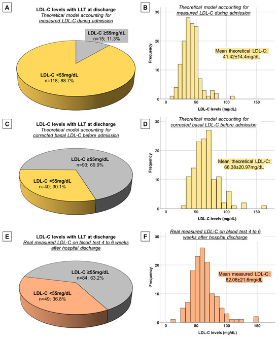 Theoretical LDL-C levels with LLT at discharge according to LDL-C during admission and corrected basal LDL-C, compared to real measured LDL-C after discharge. In the model accounting for real measured LDL-C during admission, most patients would theoretically achieve the LDL-C < 55 mg/dL target (A), and the mean theoretical LDL-C is lower (histogram in (B)). However, in the model accounting for corrected basal LDL-C, only a minority of patients would theoretically achieve target LDL levels (C), and the mean theoretical LDL-C is above 55 mg/dL (histogram in (D)). This second model is more consistent with the real measured LDL-C levels on the first blood test 4 to 6 weeks after hospital discharge (F) and the proportion of patients achieving the LDL-C target (E). Abbreviations: LDL-C = low-density lipoprotein cholesterol. LLT = lipid-lowering therapy.