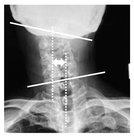CMA was defined as the angle between a line connecting the lower margins of the mandibular angle and the superior endplate of C7 on the anterior and posterior radiographs (white lines). The C2 to T1 distance was defined as the distance between the vertical line from the center of the C2 vertebra and that of the T1 vertebra on the anterior and posterior radiographs (white dotted lines).