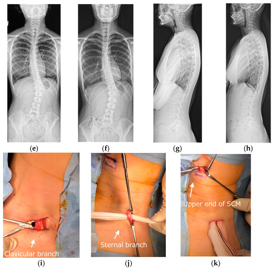 Sixteen-year-old female was treated with the bipolar release of the sternocleidomastoid. Pre- (a,b,e,g) and postoperative (c,d,f,h) appearance, radiographs, and intraoperative photographs. The head was markedly tilted to the right side, and the neck was shifted to the left side preoperatively. Right lower ends of the sternal branch and clavicular branch of the sternocleidomastoid (SCM) were released at one incision (i,j). The upper end of the SCM was released at the other incision (k). There were good improvements in appearance and postoperative X-rays after the bipolar release of SCM.