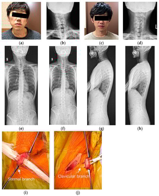 Forty-year-old male was treated with unipolar release of the sternocleidomastoid. Pre- (a,b,e,g) and postoperative (c,d,f,h) appearance, radiographs, and intraoperative photographs. The head was markedly tilted to the left side, and the neck was shifted to the right side preoperatively. Left lower ends of the sternal branch and clavicular branch of the SCM were released at two incisions (i,j). There were good improvements in appearance and postoperative X-rays after the unipolar release of SCM.