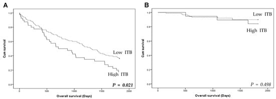 In the present study, TILs were evaluated through the classification of IS. The number of ITBs was significantly higher in cases with low IS compared to those with high IS in CRCs (3.28 ± 3.31 vs. 2.19 ± 2.59, p = 0.005; Figure 3). A strong correlation was found between high ITB and low IS (p < 0.001; Table 2). CRCs with high IS showing a higher rate of low ITB than those with low IS. Upon detailed analysis, CD8-positive lymphocytes were significantly more prevalent in the high-ITB group than in the low-ITB group (p = 0.044), whereas this was not the case for CD3-positive lymphocytes (p = 0.283). High ITB was found in 17 of 93 CRCs with high levels of CD3-positive lymphocytes (18.3%). In CRCs with low levels of CD3-positive lymphocytes, high ITB was found in 42 of 173 CRCs (24.3%). In patients with low IS, a significant correlation was observed between high ITB and worse overall survival (p = 0.021; Figure 4A). However, in the high IS group, there was no significant difference in overall survival between patients with high and low ITB (p = 0.498; Figure 4B).
