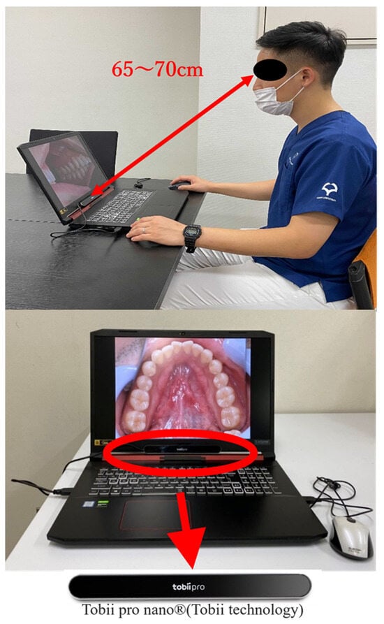 Upon calibration of the Tobii Pro Nano®, at eight points on the display, various intraoral photographs were randomly exhibited on a 17.3” full HD display (1920 × 1080) to simulate a real-world diagnostic environment. The participants were positioned at a distance of 65–70 cm from the screen to mimic a typical viewing distance in clinical practice. The participants were asked to examine each image freely, provide a clinical diagnosis, and name the potential disease. All procedures were approved by the Ethics Review Committee of the Osaka University Graduate School of Dentistry and Faculty of Dentistry Hospital (approval number: H29-E35-1). The gaze coordinate data for each photograph and the accuracy of the diagnostic results were then analyzed using Tobii Pro Lab® gaze analysis software version 1.217 (Tobii Technology Corporation, Tokyo, Japan). Any gaze points with a duration of less than 250 ms were excluded to ensure a reliable analysis of the gaze data, following established guidelines that an average gaze time of 250–300 ms is necessary for visual information to be processed by the brain [14,15].