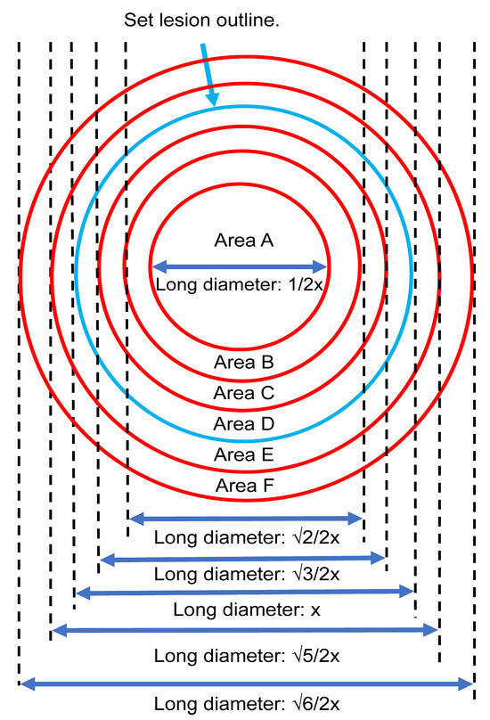 The lesion area and the surrounding region were divided into six equal areas (A–F) based on multiple clinicians’ perspectives to facilitate further analysis. The interior of the lesion was labeled as areas A–D, while the periphery was labeled as area E and F (Figure 3).
