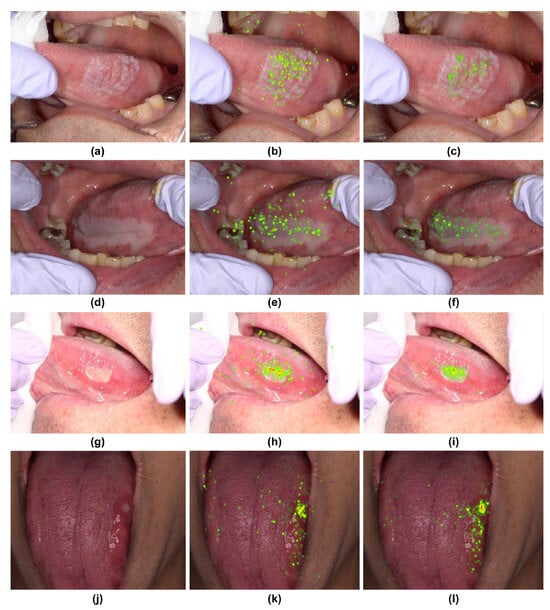 Heatmap comparison of gaze patterns during medical examinations. (a,d,g,j) Original images. (b,e,h,k) Heatmap based on gaze data from skilled oral surgeons. (c,f,i,l) Heatmap based on gaze data from general dentists.