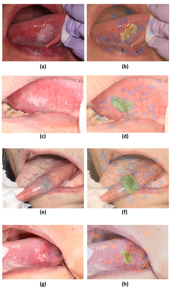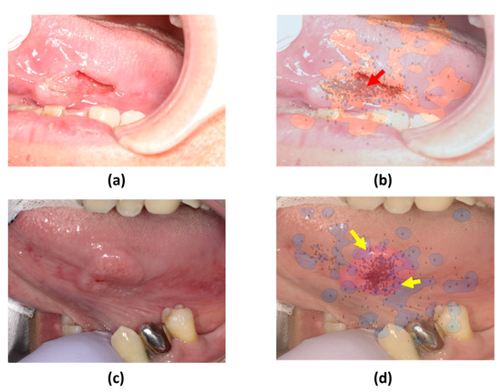Oral cancer is relatively rare, accounting for less than 5% of all carcinomas. More than 300,000 new cases of oral cancer are reported globally each year [1,2,3]. Unlike gastrointestinal cancers, oral mucosal diseases, including malignant tumors and precancerous lesions, can be visually detected without complex devices such as endoscopes. Regular oral health checkups facilitate the early detection of such lesions [3], making timely therapeutic intervention possible and improving survival rates [4,5]. However, many oral mucosal diseases are diagnosed at an advanced stage because of inadequate risk assessment and delayed referrals to higher-level medical facilities [6]. Thus, effective screening methods for oral mucosal diseases are needed. Such methods enable appropriate risk assessment before the disease advances. Objective assessment of the oral cavity through visual examination and palpation is indispensable. Besides palpation, early tongue cancer hardness assessments have been conducted using ultrasonography [7]. However, accurate assessments remain challenging for clinicians due to the limited number of cases and evaluation criteria. For visual examination, numerous atlases visually present features associated with oral mucosal diseases. However, the vast diversity of diseases listed for each differential diagnosis results in scattered cases where the diagnosis is complicated [8].