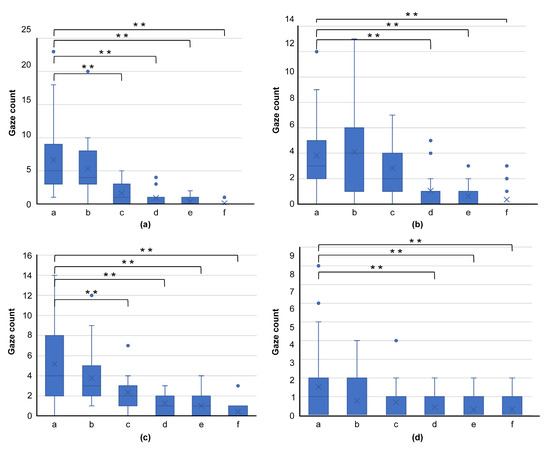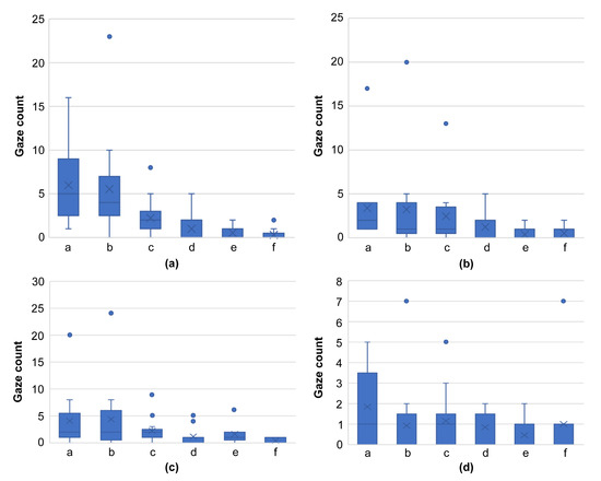 In terms of gaze frequency per region (a–f) for skilled oral surgeons (Figure 7) and general dentists (Figure 8), no significant difference in gaze frequency was observed among the oral surgeons across different regions. However, general dentists showed clear differentiation, focusing more on region “a.”