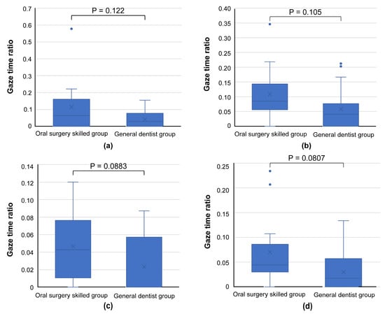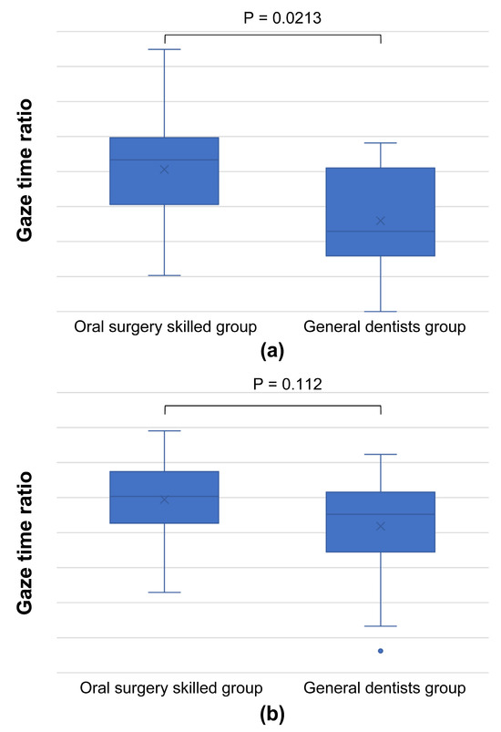 A comparison of the gaze time ratios for photographs showing a common trend in SVM revealed a tendency for skilled oral surgeons to spend more time examining the same region than general dentists (Figure 9).